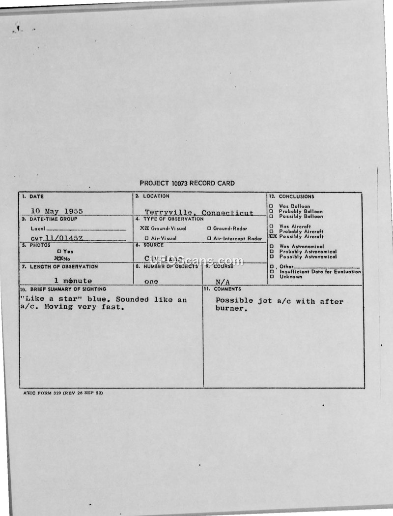 Project 10073 Record Card — Terryville, Connecticut, 10 May 1955