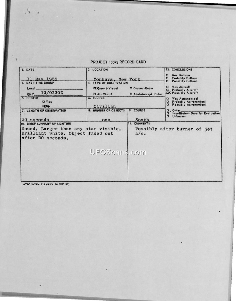 A civilian in Yonkers, NY, reported a brilliant white, round object on May 12, 1955. The Air Technical Intelligence Center concluded the object was likely an aircraft using an afterburner.