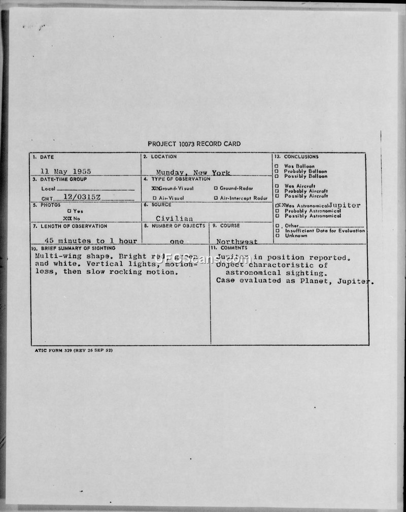 A civilian GOC observer reported a multi-colored, multi-wing shaped object in Munday, New York, on May 11, 1955. The Air Technical Intelligence Center (ATIC) officially identified the object as the planet Jupiter.