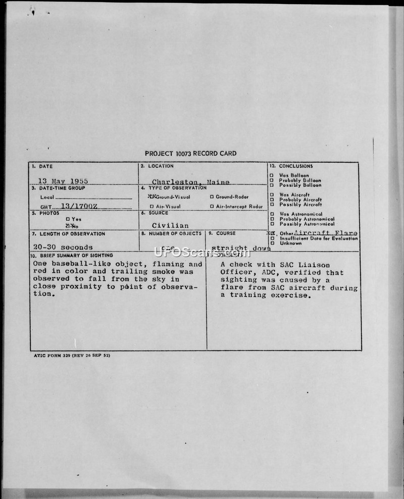 On May 13, 1955, at 1700Z, a civilian witness in Charleston, Maine, observed a single, baseball-sized object falling from the sky. The object was described as flaming, red in color, and trailing smoke. The observation lasted between 20 and 30 seconds, and the object was reported to have moved in a straight downward path. The witness reported no sound associated with the object. Following the report, an investigation was conducted by the Air Defense Command (ADC) in coordination with a Strategic Air Command (SAC) Liaison Officer. The investigation concluded that the sighting was not an unidentified aerial phenomenon, but rather a flare deployed by a SAC aircraft during a training exercise. Supporting documentation indicates that two interceptors from the 40th Fighter Interceptor Squadron were scrambled at 1735Z on the same day, though they did not report seeing anything unusual. The final assessment, signed by Lt. Col. William J. Wilt, confirmed the identification of the object as a flare.