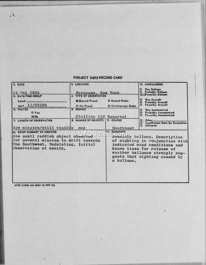 Project 10073 Record Card — Syracuse, New York, 14 May 1955