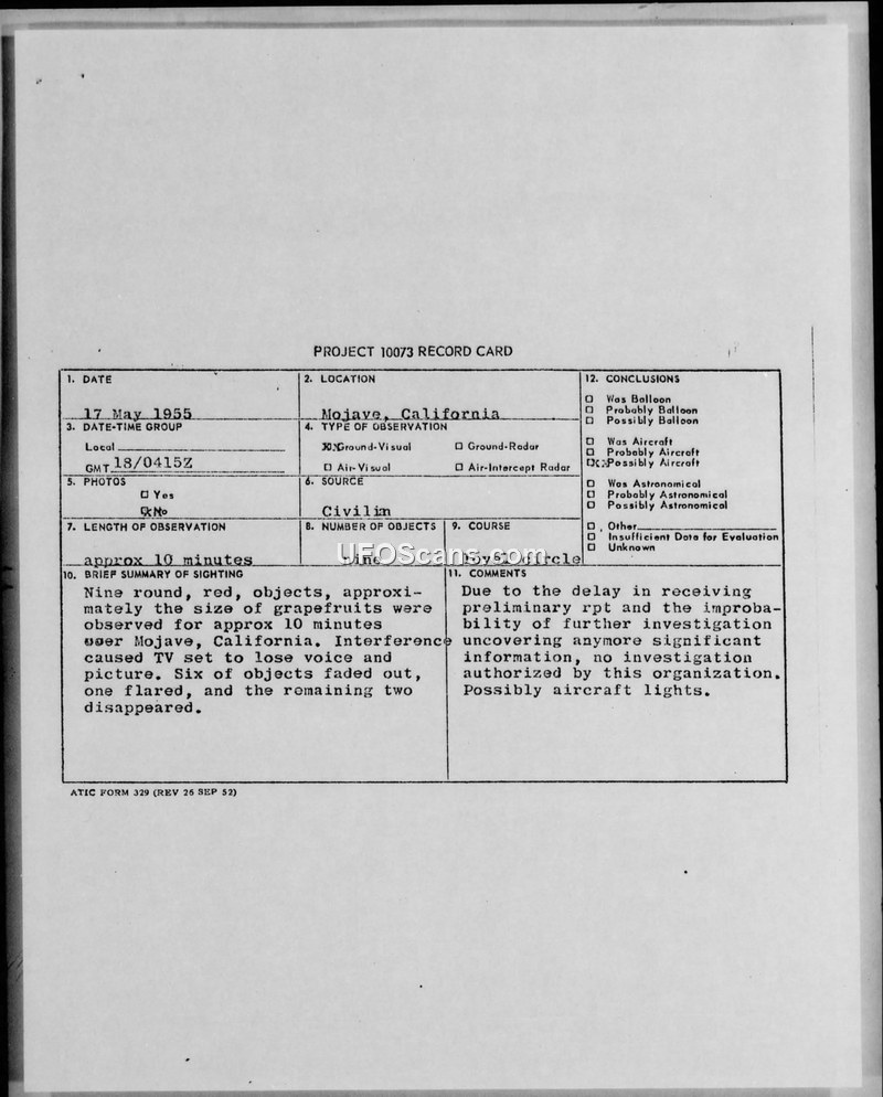On 17 May 1955, at 0415Z, a sighting occurred over Mojave, California, involving nine round, red objects estimated to be the size of grapefruits. The objects were observed for approximately ten minutes by witnesses, including a local laborer and a businessman. The objects were reported to be moving in a level circle. During the observation, the witnesses reported electromagnetic interference that caused their television set to lose both voice and picture. The behavior of the objects was described as six fading out, one flaring, and the remaining two disappearing. The report was processed by the 752nd ACWRON and forwarded to higher commands, including the Air Technical Intelligence Center (ATIC). The official conclusion reached by the organization was that the objects were possibly aircraft lights. The investigation was ultimately closed without further action, citing a delay in the receipt of the preliminary report and the belief that further investigation would not yield significant new information.