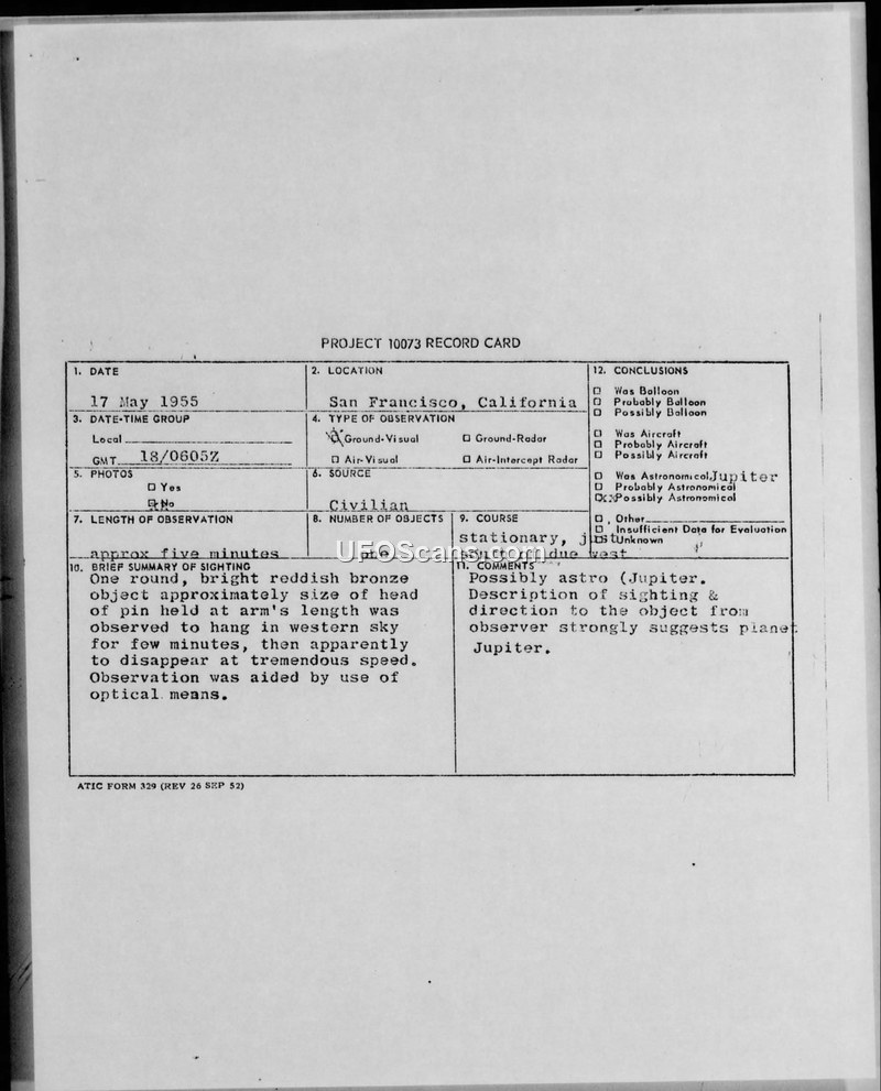 Project 10073 Record Card — San Francisco, California, 17 May 1955