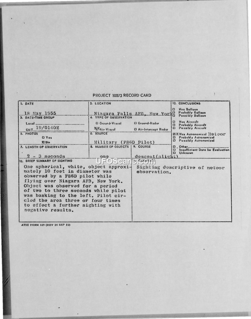 This document consists of a Project 10073 record card and associated teletype reports detailing an aerial sighting that occurred on 18 May 1955 near Niagara Falls Air Force Base, New York. An F86D military pilot reported observing a spherical, white object, estimated to be approximately 10 feet in diameter, while flying at an altitude of 24,500 feet. The pilot described the object's appearance as resembling a blast of air being blown into a flame. The observation lasted for a duration of two to three seconds while the pilot was banking to the left. Following the initial sighting, the pilot circled the area three or four times in an attempt to re-acquire the object, but these efforts yielded negative results. The 763rd AC&W Squadron confirmed that there was no other air traffic in the vicinity at the time of the incident. Weather conditions were reported as clear with 10 miles of visibility. The official conclusion reached by the Air Technical Intelligence Center (ATIC) was that the sighting was an astronomical meteor. Internal notes on the record card suggest that due to the brevity of the sighting and the object's characteristics, no further investigation was authorized, though one note mentions a potential balloon-like characteristic before settling on the meteor classification.