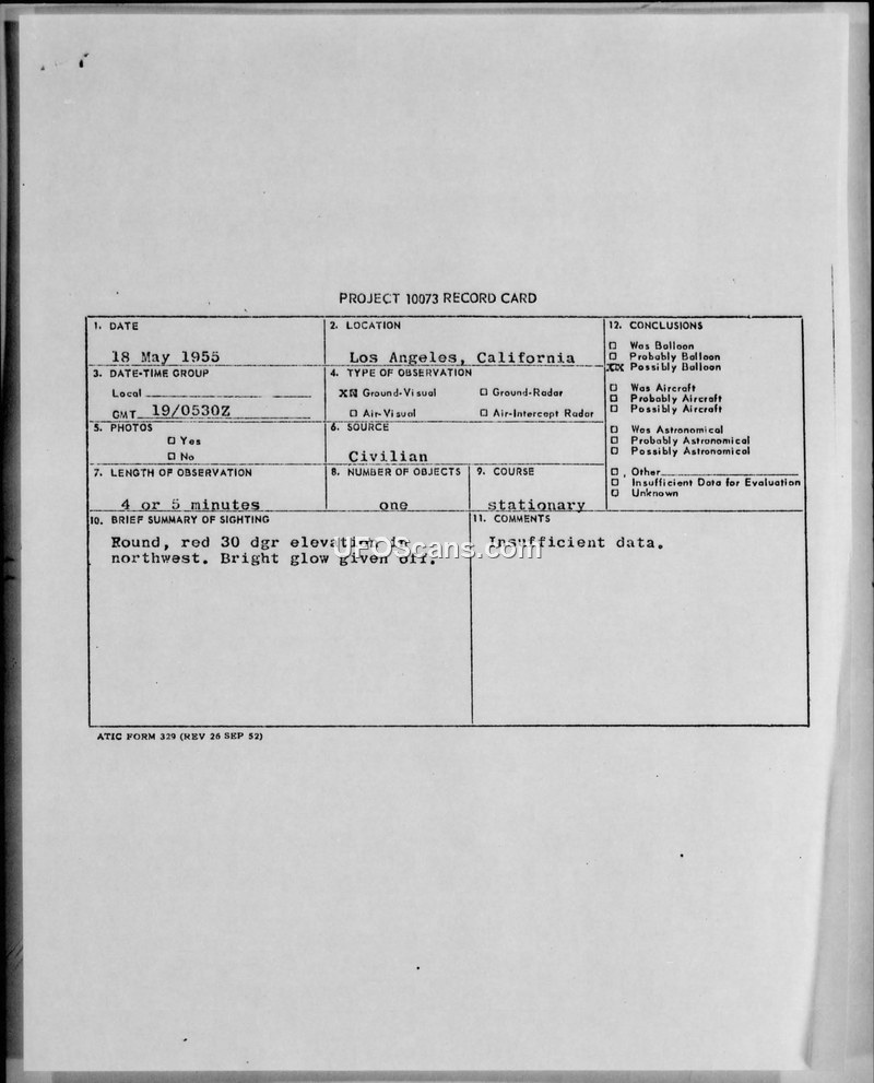 Project 10073 Record Card — Los Angeles, California, 18 May 1955