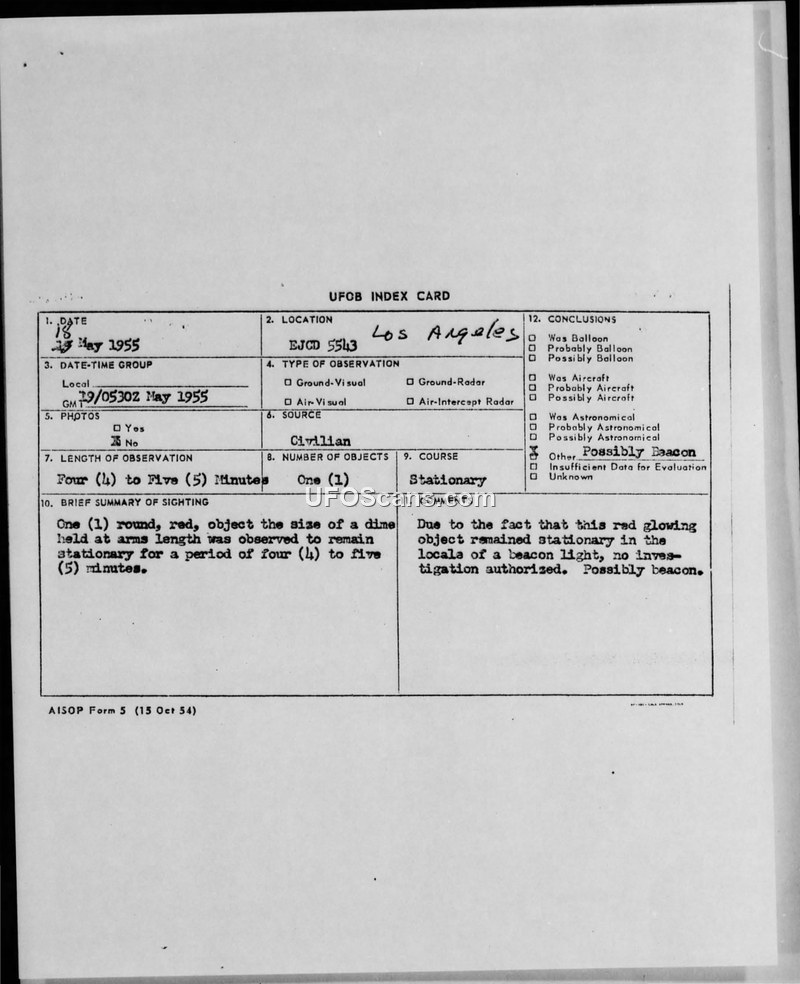 This document is a UFOB Index Card documenting a sighting that occurred on 18 May 1955 in Los Angeles. The witness reported observing a single, round, red, glowing object. The observer estimated the size of the object to be equivalent to a dime held at arm's length. The object remained stationary for a duration of four to five minutes. The report indicates that no photographs were taken and there was no radar contact. The official conclusion recorded on the card suggests that the object was possibly a beacon light. Because the object remained stationary in the vicinity of a known beacon light, the authorities determined that no further investigation was required.