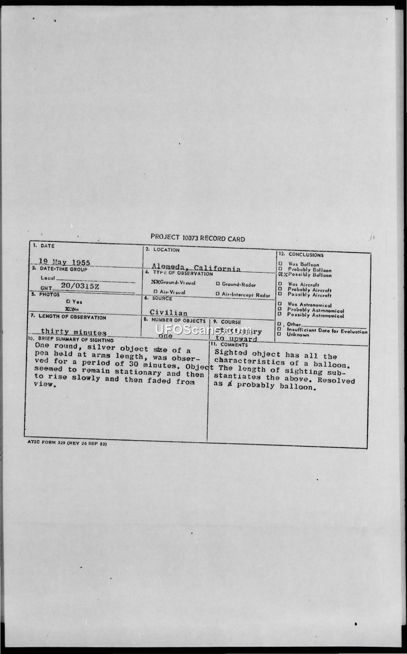 PROJECT 10073 RECORD CARD — Alameda, California, 19 May 1955