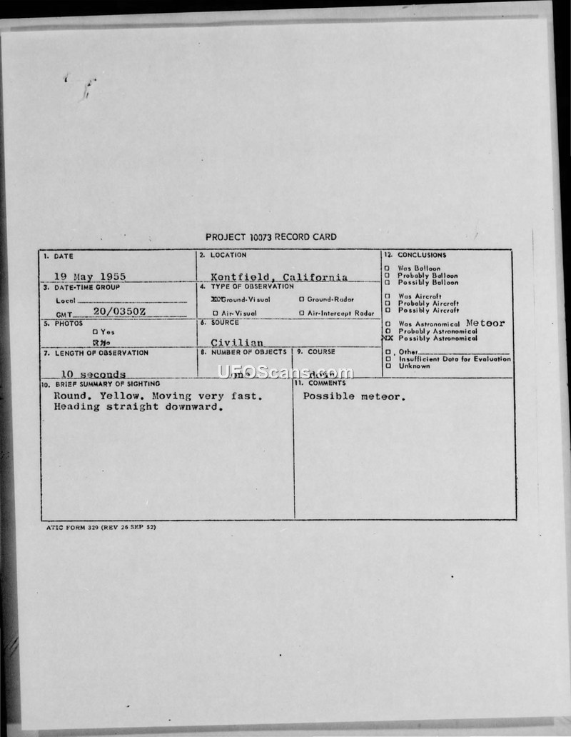 Project 10073 Record Card — Kentfield, California, 19 May 1955