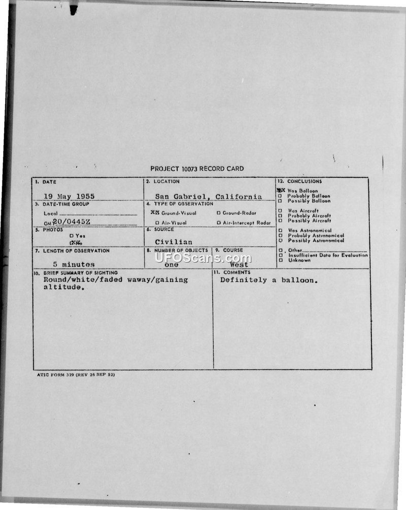 A civilian in San Gabriel, California, reported a round, white object on May 19, 1955. The military evaluated the sighting and concluded it was definitely a balloon, requiring no further investigation.