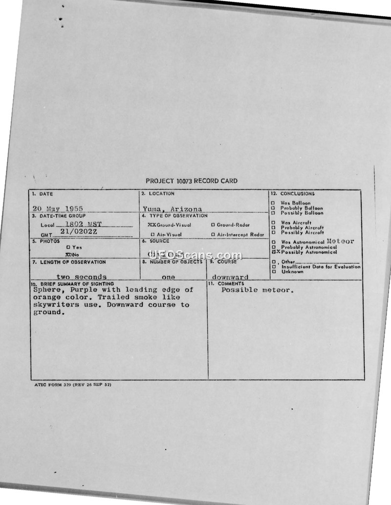 A civilian witness in Yuma, Arizona, reported a two-second sighting of a purple and orange spherical object on May 20, 1955. The military investigation concluded the object was likely a meteor or an aircraft flare.