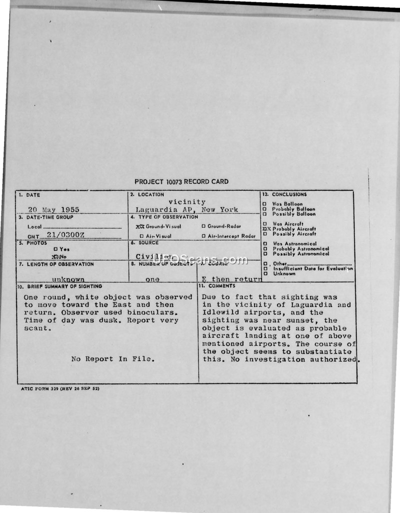 This document is a Project 10073 Record Card documenting a sighting that occurred on May 20, 1955, in the vicinity of Laguardia Airport, New York. A civilian observer reported seeing a single, round, white object at dusk. The observer utilized binoculars to track the object, which was described as moving toward the East before returning. The report notes that the information provided was very scant and that no further report was found in the file. The official evaluation concluded that the object was likely an aircraft landing at either Laguardia or Idlewild airports, noting that the object's course substantiated this assessment. Consequently, no formal investigation was authorized for this incident.