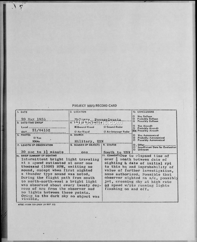 Project 10073 Record Card: Sighting near Malvern, Pennsylvania, 20 May 1955