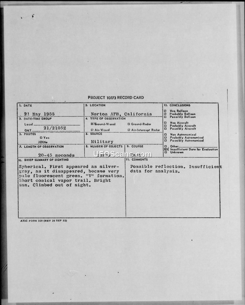 On May 21, 1955, at 2105Z, two military personnel stationed at Norton Air Force Base, California, observed three spherical objects in the sky. The witnesses, identified as a Major and a 1st Lieutenant from the 27th Air Division, were described as very reliable. The objects were initially observed as silver-gray and arranged in a 'V' formation. As the objects disappeared, they reportedly turned a pale fluorescent green. The witnesses noted that the objects possessed a short, conical vapor-type tail and were observed while the witnesses were watching two flights of jet fighters passing to the east. The duration of the sighting was estimated between 20 and 45 seconds. The objects were observed under conditions of bright sun, scattered high haze, and occasional small cumulus clouds. A check of the local direction center confirmed the presence of the two jet flights but yielded negative results for any other aircraft in the area. The official conclusion reached by the headquarters was that the sighting was likely a result of sun reflection on aircraft or shadows, given that the sun's azimuth and the azimuth of the objects were approximately the same. The incident was documented on a Project 10073 record card and an information report, both of which categorized the data as insufficient for a definitive evaluation.