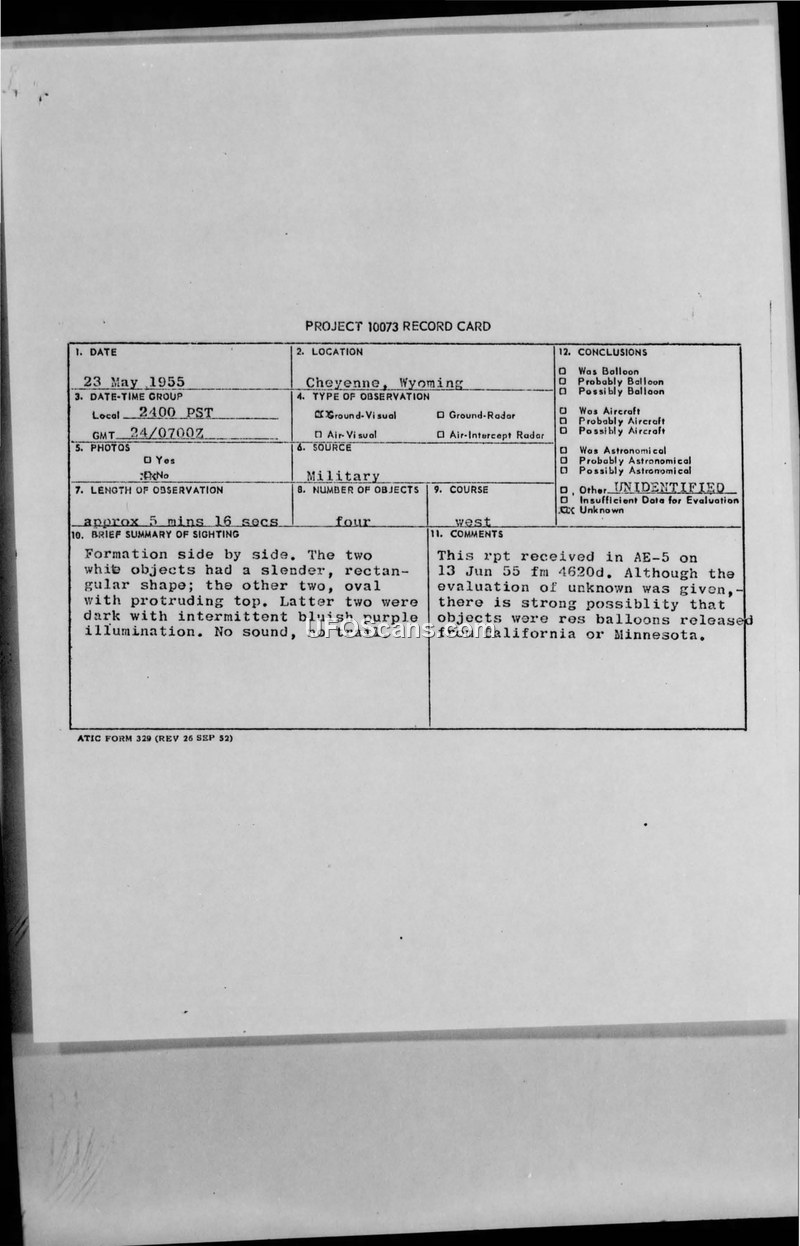 Project 10073 Record Card — Cheyenne, Wyoming, 23 May 1955
