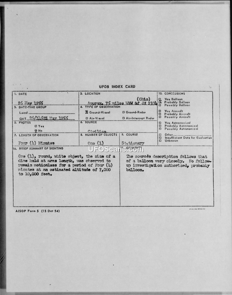 UFOB Index Card — 26 May 1955, Ohio