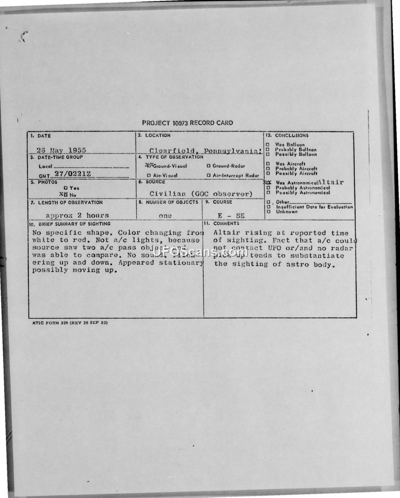 Project 10073 Record Card — Clearfield, Pennsylvania, 26 May 1955