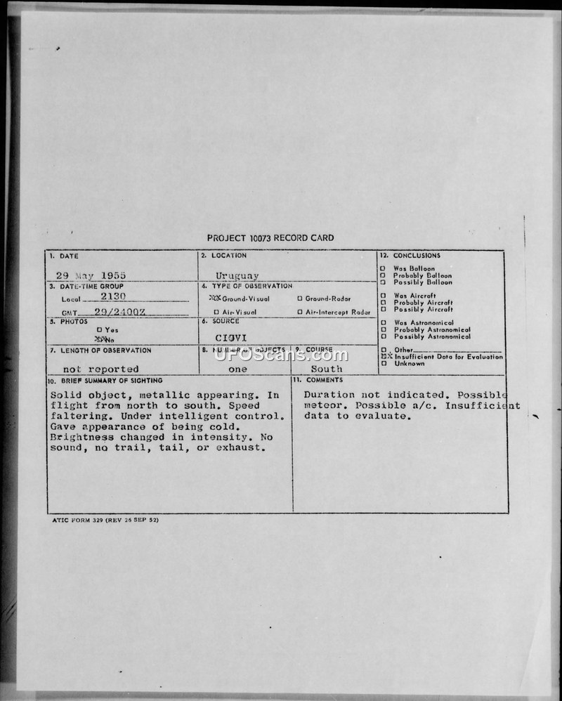 Project 10073 Record Card and Observation Report — Uruguay, May 1955