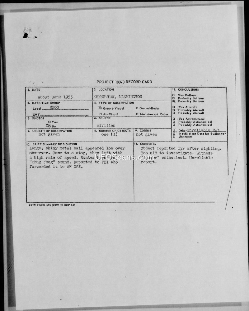 A police officer reported a UFO sighting in Kennewick, Washington, one year after the event. The Air Force dismissed the report as a balloon, citing the witness's bias and the significant delay in reporting.