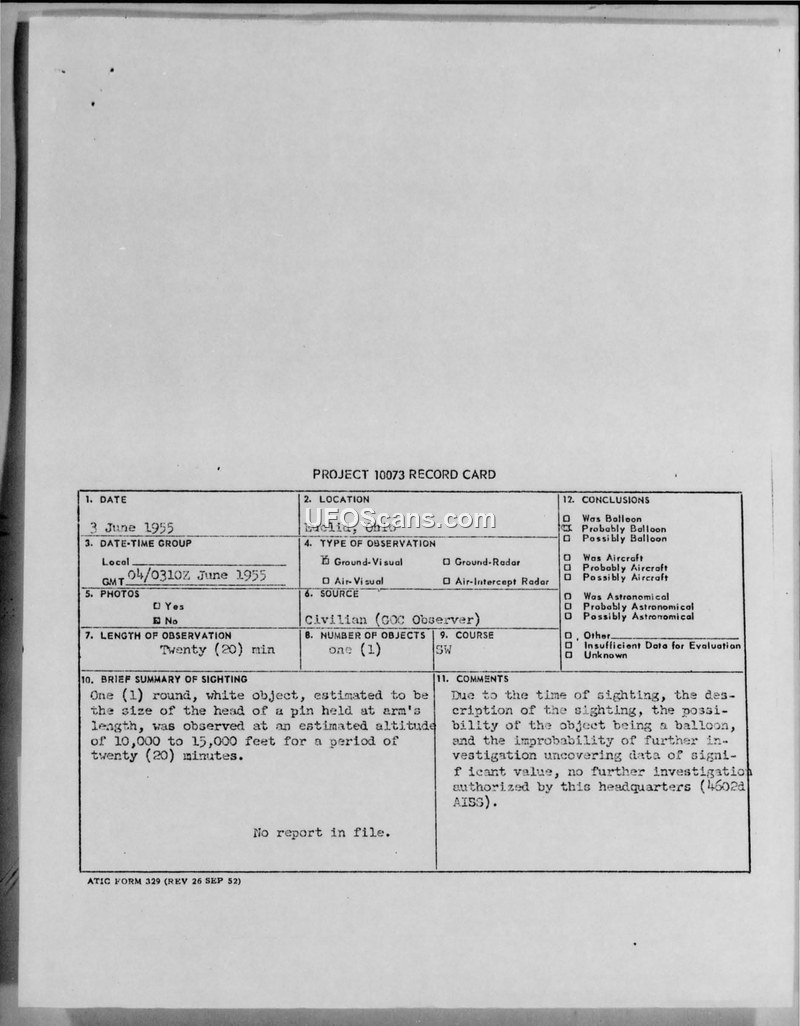 A civilian GOC observer reported a round, white object over Euclid, Ohio, on June 3, 1955. The 4602d AISS concluded it was likely a balloon and closed the case without further investigation.