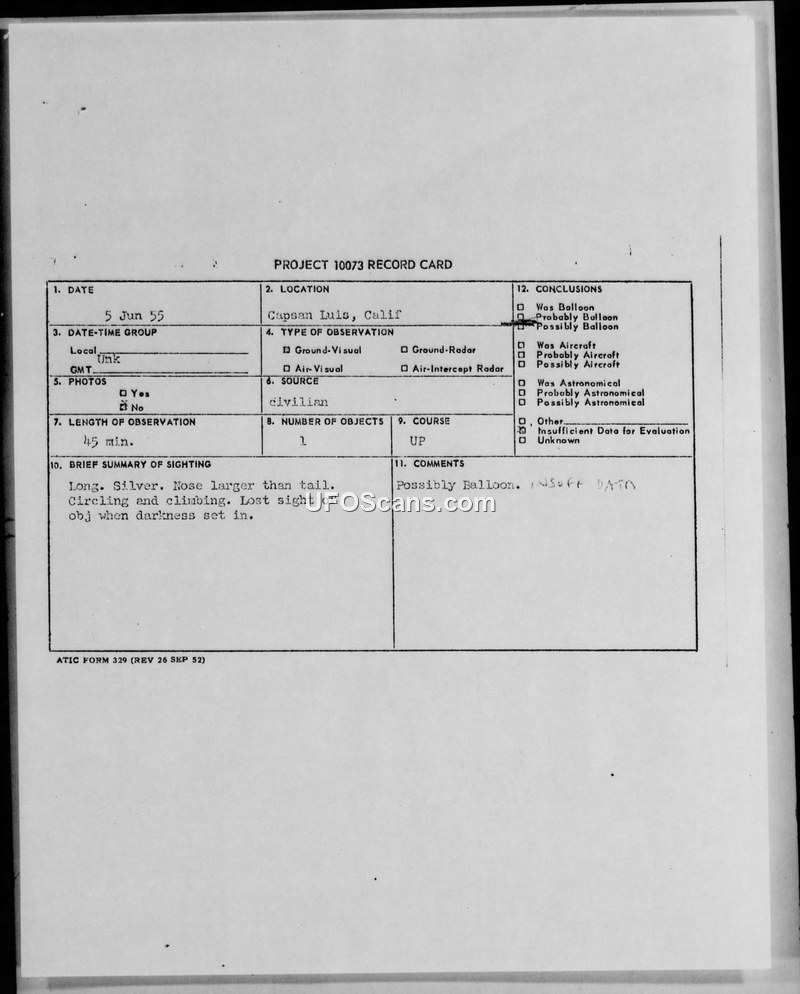 Project 10073 Record Card — 5 Jun 55, Capsan Luis, Calif
