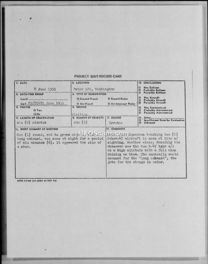 Project 10073 Record Card and UFOB Report — Paine AFB, Washington, 8 June 1955