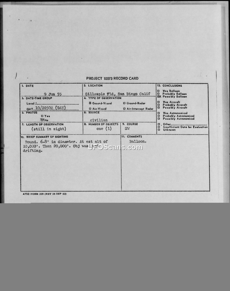 Project 10073 Record Card — Gillespie Field, San Diego, 9 June 1955