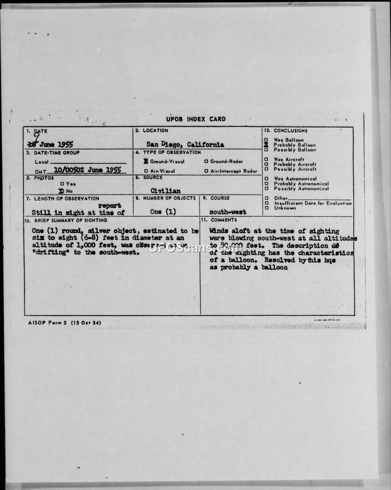 A civilian report of a round, silver object in San Diego on June 9, 1955, was investigated and officially concluded to be a balloon.
