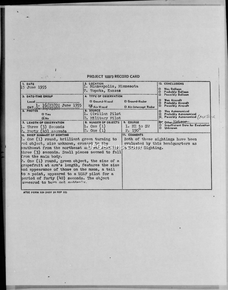 Two UFO sightings reported on 15 June 1955 in Minnesota and Kansas were evaluated by the Air Technical Intelligence Center. Both incidents were officially classified as meteor sightings.