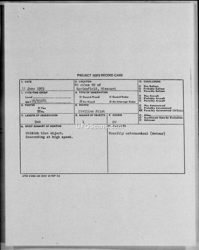 A civilian pilot reported a whitish blue object descending at high speed near Springfield, Missouri, on June 15, 1955. Although the pilot noted it did not look like a meteor, official records categorized the sighting as a possible meteor.
