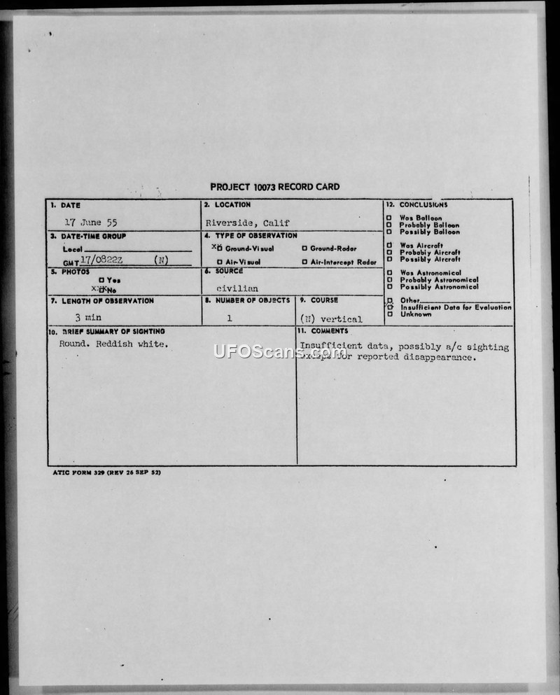 On June 17, 1955, at 0822Z, a 15-year-old civilian witness in Riverside, California, observed a single, round, reddish-white object for a duration of three minutes. The witness described the object as appearing to be the size of a dime held at arm's length. The object was initially stationary but was reported to have moved in a vertical path before disappearing over the horizon. The sighting was documented on a Project 10073 record card and an UFOB Index Card (AISS-UFOB-181-55). The official evaluation concluded that the characteristics of the object were consistent with a balloon, despite the witness's report of the object moving 'straight up' and disappearing. The investigating authority noted that while the reported movement did not fully align with a standard balloon sighting, the available facts supported that conclusion, and no further investigation was authorized.
