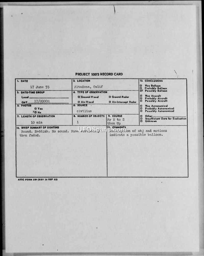 On June 17, 1955, at 0900Z, a civilian Ground Observer Corps (GOC) observer in Altadena, California, reported a sighting of an unidentified aerial object. The witness described the object as round and reddish in color, appearing to be the size of a half-dollar held at arm's length. The object was observed for approximately ten minutes, during which it traveled from the north to the south, then rose vertically before fading from view. The observer noted that there was no sound associated with the object. Weather conditions at the time were reported as clear with five miles of visibility and some haze. The sighting was documented on a Project 10073 record card and reported via military message channels. The investigation, conducted by 1st Lt. Guy Renfroe, concluded that the sighting was likely a balloon. The report suggests that because the observer was in a brightly lit area, the object may have been illuminated by the reflection of city lights. Due to the description and the duration of the sighting, the official assessment was that the characteristics were consistent with a balloon, and no further investigation was authorized. The report also notes that an extreme time delay in reporting prevented a more thorough preliminary evaluation.