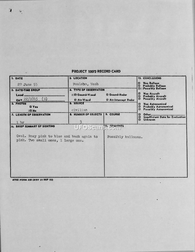 A GOC observer in Poulsbo, Washington, reported three oval, color-changing objects on 22 June 1955. Air Force investigators concluded the sighting was likely caused by a weather balloon released from Sandpoint Naval Air Station.