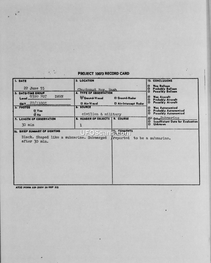 A sighting of a submarine-shaped object in Chuckanut Bay, Washington, on 22 June 1955 was reported by two witnesses. The military investigation concluded the object was a submarine.