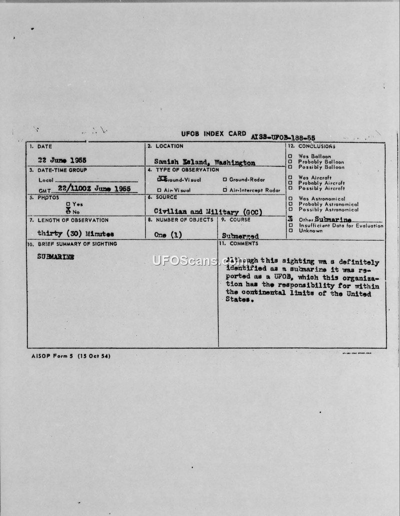 A 1955 report from Samish Island, Washington, documents a sighting of a submarine that was erroneously or procedurally reported as a UFOB. The document confirms the object was identified as a submarine despite its inclusion in the UFOB index.