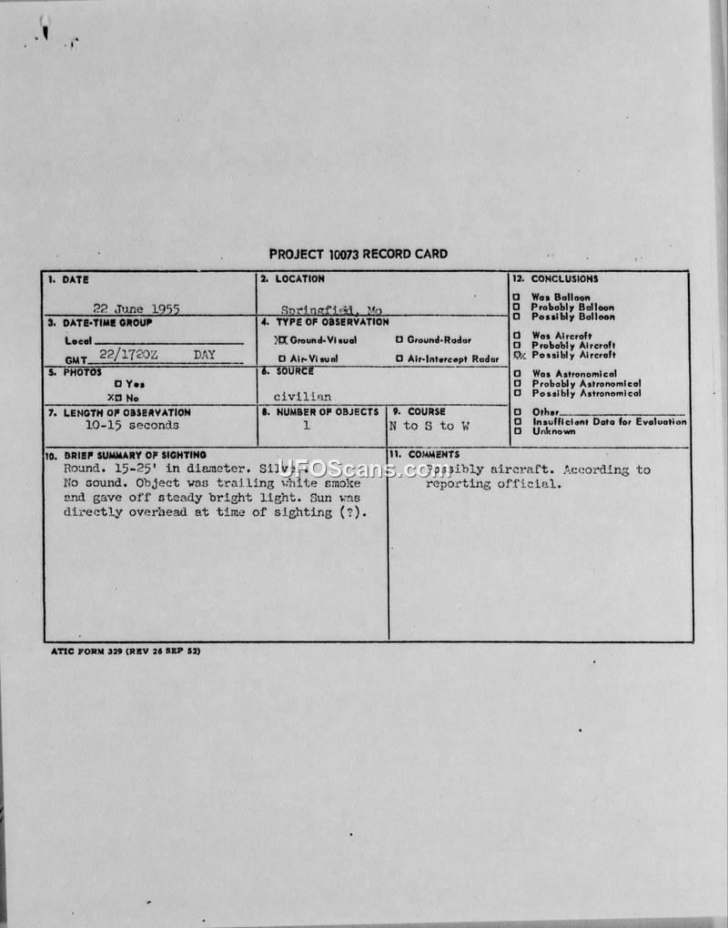 A correctional officer in Springfield, Missouri, reported a low-altitude, silver, round object trailing smoke on June 22, 1955. Air Force investigators concluded it was possibly an aircraft, despite the lack of a flight plan.