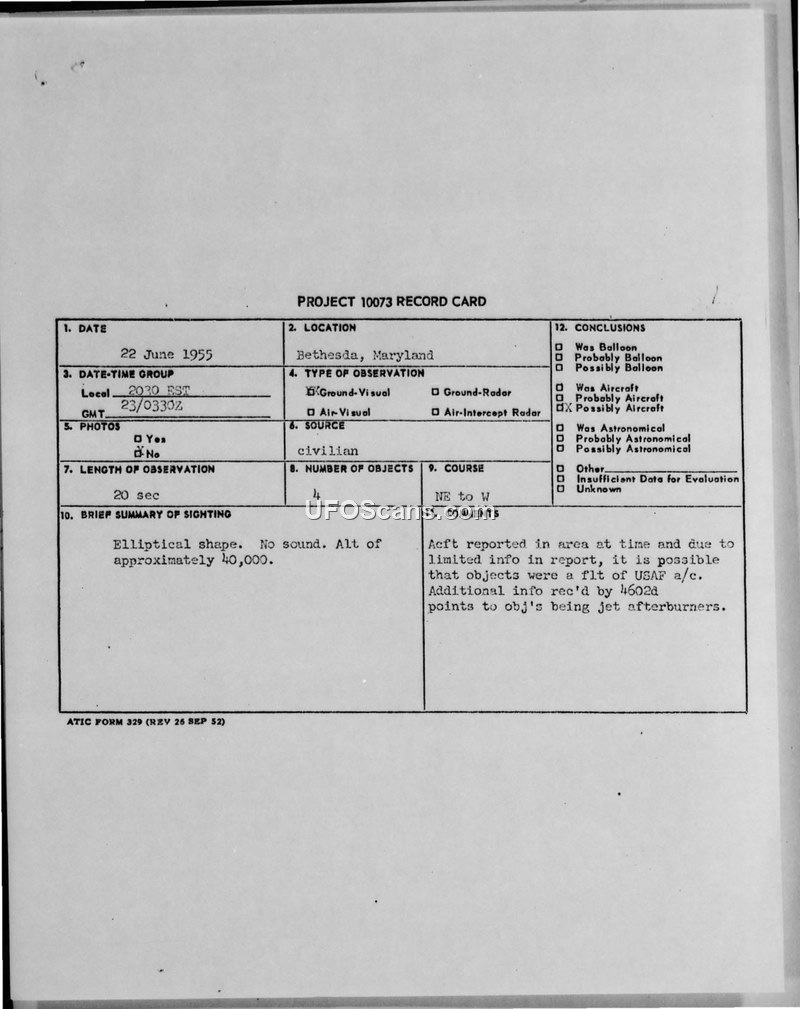 A civilian in Bethesda, MD, reported four glowing elliptical objects at 40,000 feet on June 22, 1955. ATIC concluded the objects were likely USAF jet afterburners.