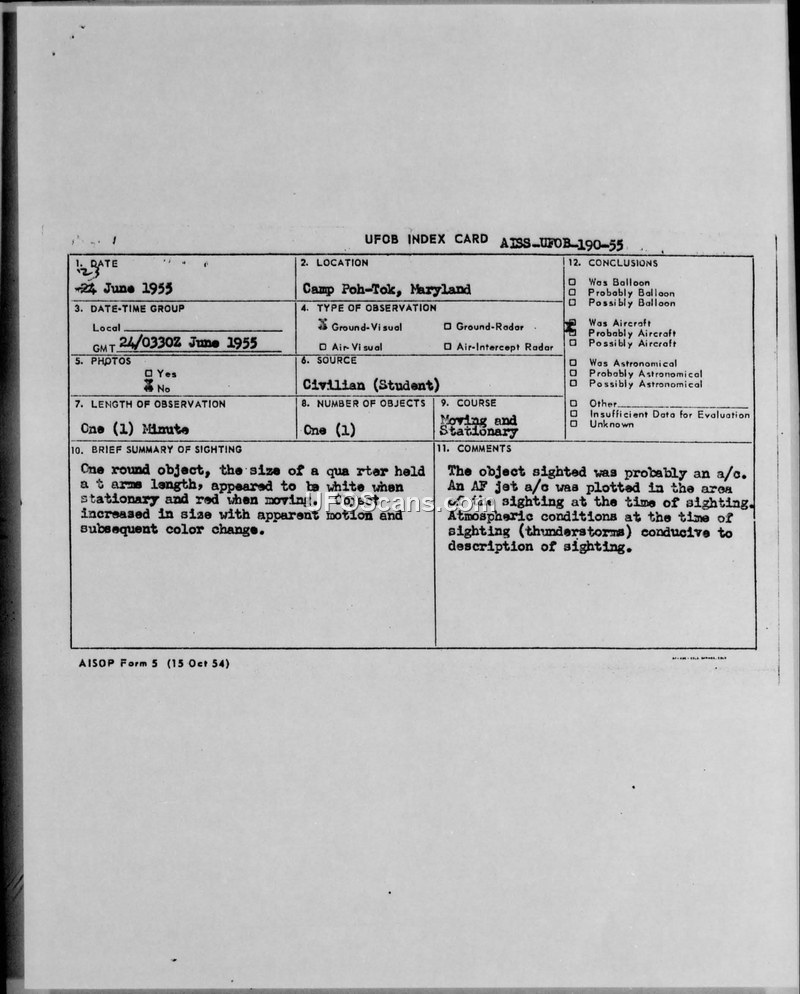 This document is a UFOB Index Card (AISS-UFOB-190-55) detailing a sighting that occurred on 24 June 1955 at 0330Z near Camp Poh-Tok, Maryland. The witness, identified as a civilian student, reported observing a single round object for a duration of one minute. The witness described the object as appearing the size of a quarter held at arm's length. Its appearance changed during the observation; it was reported as white when stationary and red when moving. The witness further noted that the object increased in size in conjunction with its apparent motion and a subsequent color change. The official conclusion recorded on the card suggests that the object was likely an aircraft. This assessment is based on the fact that an Air Force jet was plotted in the area at the time of the sighting. Additionally, the report notes that atmospheric conditions, specifically the presence of thunderstorms, were considered conducive to the witness's description of the event.