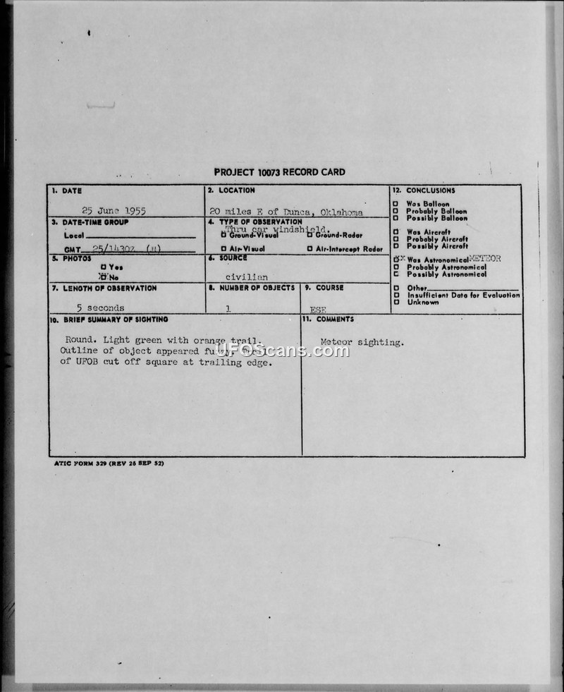 Project 10073 Record Card — 25 June 1955, Duncan, Oklahoma
