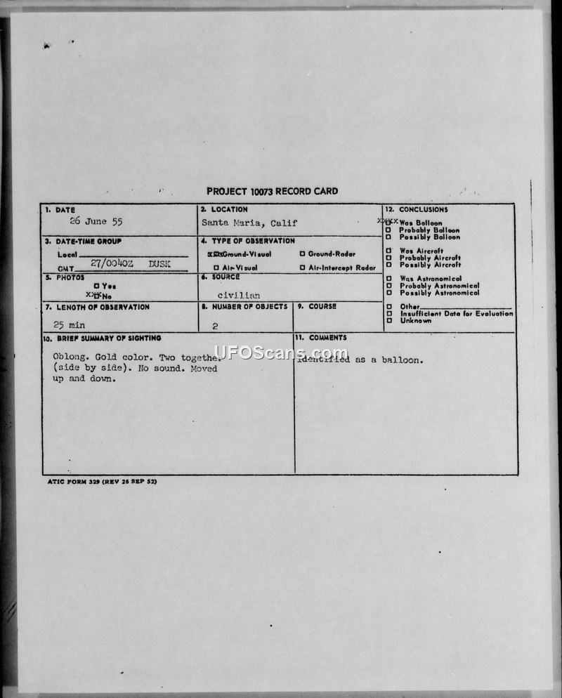 Project 10073 Record Card — Santa Maria, California, 26 June 1955