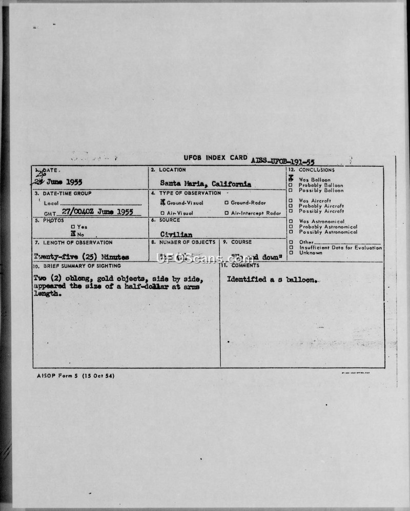 A 1955 UFOB index card documenting a civilian sighting of two gold, oblong objects in Santa Maria, California. The incident was officially concluded to be a balloon.