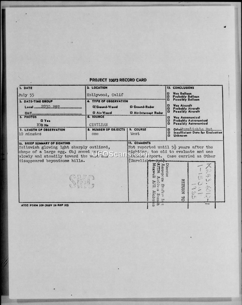 This document contains two Project 10073 record cards detailing civilian sightings of unidentified aerial phenomena in Hollywood, California, during July 1955. The first report describes a yellowish, glowing, egg-shaped object that moved slowly and steadily toward the west before disappearing behind hills. This report was filed 5.5 years after the incident, leading investigators to categorize it as an 'unreliable report' and 'Other' due to the significant delay and lack of corroborating witnesses. The second record card details a sighting on July 8, 1955, of a round, white object with green coloration, which was observed for 3 to 4 seconds. This event was officially concluded to be a meteor sighting. The document includes the associated U.S. Air Force Technical Information Sheets, which provided the raw data for these records. These sheets include the witness's personal account, where they describe seeing a bright light outside their living room window, and their subsequent attempt to observe the object further. The witness, a 40-year-old administrative secretary, provided details on the object's appearance, movement, and the environmental conditions at the time of the sighting. The forms also include sketches and diagrams intended to help the witness communicate the object's trajectory and angular size relative to the horizon. Despite the detailed questionnaire, the official evaluation remained dismissive of the first report due to the time elapsed, while the second was identified as a natural astronomical phenomenon.