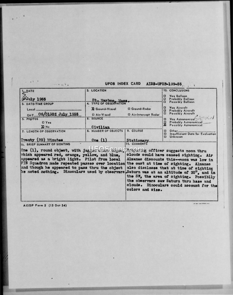 This document is a UFOB Index Card (AISB-UFOB-199-55) detailing a sighting that occurred on July 6, 1955, at 0150Z in St. Marboo, Massachusetts. The report describes a single, round object with jagged outer edges that appeared as a bright light, displaying red, orange, yellow, and blue colors. The object remained stationary for a duration of twenty minutes. A pilot from a local FIS Squadron conducted repeated passes over the location but reported noting nothing unusual while passing through the object's position. Observers utilized binoculars during the sighting. The official conclusion provided on the card suggests that the phenomenon was likely the planet Saturn. The investigating officer referenced the Air Almanac, which indicated that Saturn was positioned at an altitude of 30 degrees in the southwest at the time of the sighting. The report posits that the observers were viewing Saturn through haze and clouds, and that the use of binoculars likely accounted for the perceived colors and size of the object. The report explicitly discounts the moon as a potential source, noting that the moon was low in the east at the time of the observation.