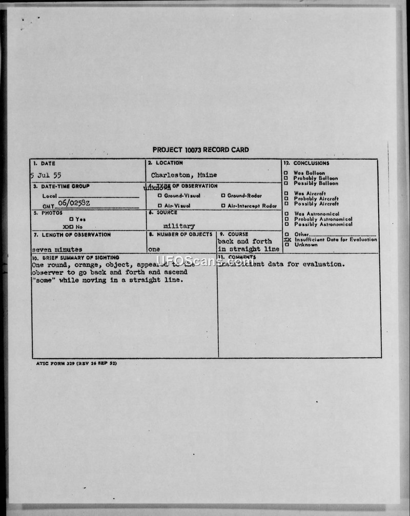 A 1955 sighting report from Charleston, Maine, describes a round, orange object observed for seven minutes. Military investigators concluded there was insufficient data for a definitive identification, noting it could have been a weather balloon.