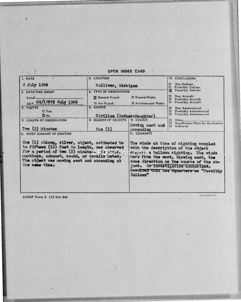 A civilian report of a 15-foot silver, oblong object in Gulliver, Michigan, on July 6, 1955. The military concluded the object was likely a balloon due to wind patterns.