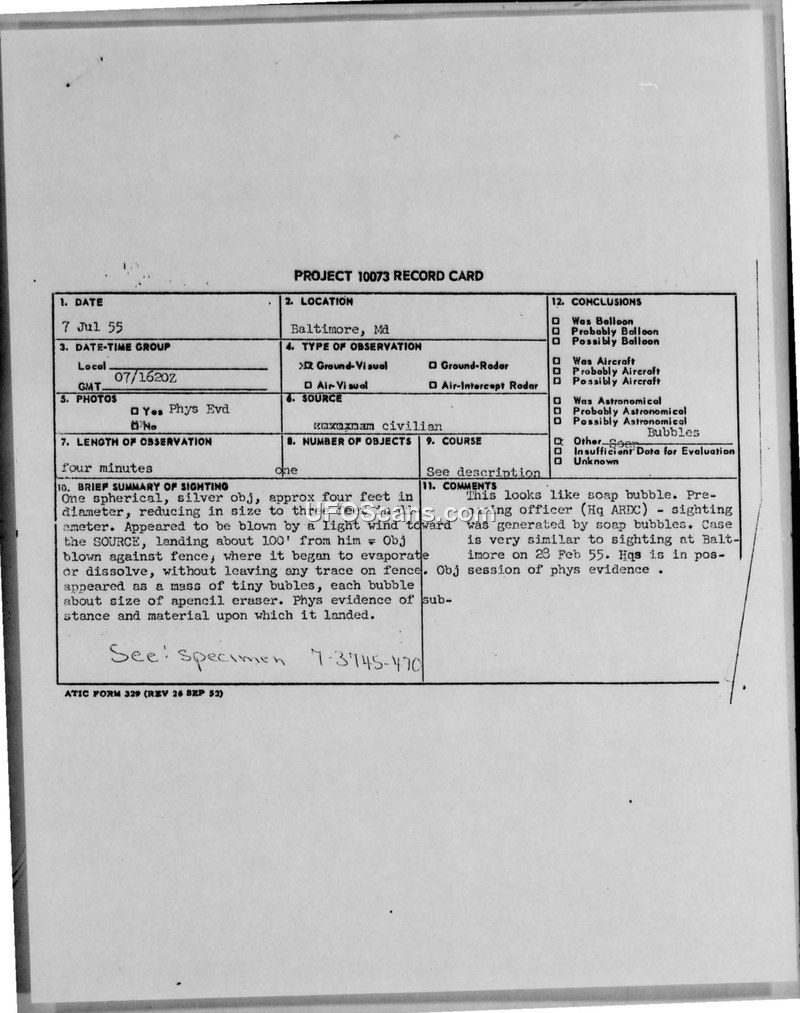 This document is a Project 10073 record card detailing a sighting that occurred on July 7, 1955, in Baltimore, Maryland. A civilian witness reported observing a single spherical, silver object for a duration of four minutes. The object was estimated to be approximately four feet in diameter, though it reportedly reduced in size to three feet. According to the report, the object appeared to be moved by a light wind toward the witness, eventually landing about 100 feet away. Upon hitting a fence, the object began to evaporate or dissolve, leaving behind a mass of tiny bubbles, each roughly the size of a pencil eraser. The report notes that physical evidence of the substance and the material it landed upon was collected. The evaluating officer from Hq ARDC concluded that the object was a soap bubble, citing the physical description and behavior of the object. The report further notes that this incident was very similar to a previous sighting that occurred in Baltimore on February 28, 1955. The document confirms that headquarters was in possession of the physical evidence collected from the site.