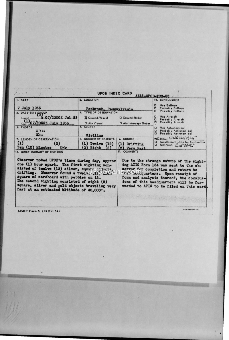 UFOB Index Cards and Related Correspondence — Penbrook, Pennsylvania, July 1955