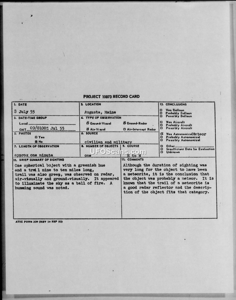 A spherical, green object with a long trail was observed over Augusta, Maine, on July 9, 1955, by both civilian and military personnel. The Air Technical Intelligence Center concluded the object was likely a meteor.