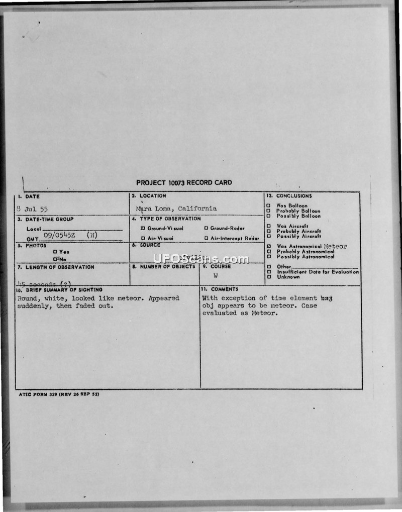 This report investigates three separate UFO sightings in California on July 9, 1955. Investigators concluded the sightings were likely optical phenomena or meteors, citing atmospheric conditions and witness unreliability.