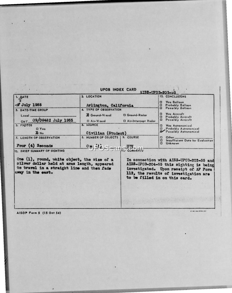 This document is an Air Intelligence Information Report (IC-UFOB-10-55) detailing a sighting of an unidentified aerial object on July 9, 1955, at 090648Z. The witness, a 13-year-old student and member of the Ground Observer Corps, was on duty at the Arlington Ground Observation Post in California when he observed a single, round, white object. The object, described as being between the size of a half-dollar and a volleyball when held at arm's length, appeared in the sky and traveled in a downward arc from the Northwest to the Northeast. The observation lasted approximately four to five seconds. The witness noted that the object appeared brighter than the background, did not flicker, and left a tail or trail that changed color from orange to red and then to blue. The witness stated that he had seen meteors before but had never seen one at such close range, leading him to question if the object was indeed a meteor. The report includes a formal statement from the witness, which was verified as a true copy by Captain Patrick O. Shere of the USAF. The investigation, which also referenced two other reports (AISS-UFOB-202-55 and AISS-UFOB-204-55), concluded that there was insufficient data to reach a definitive explanation for the sighting.