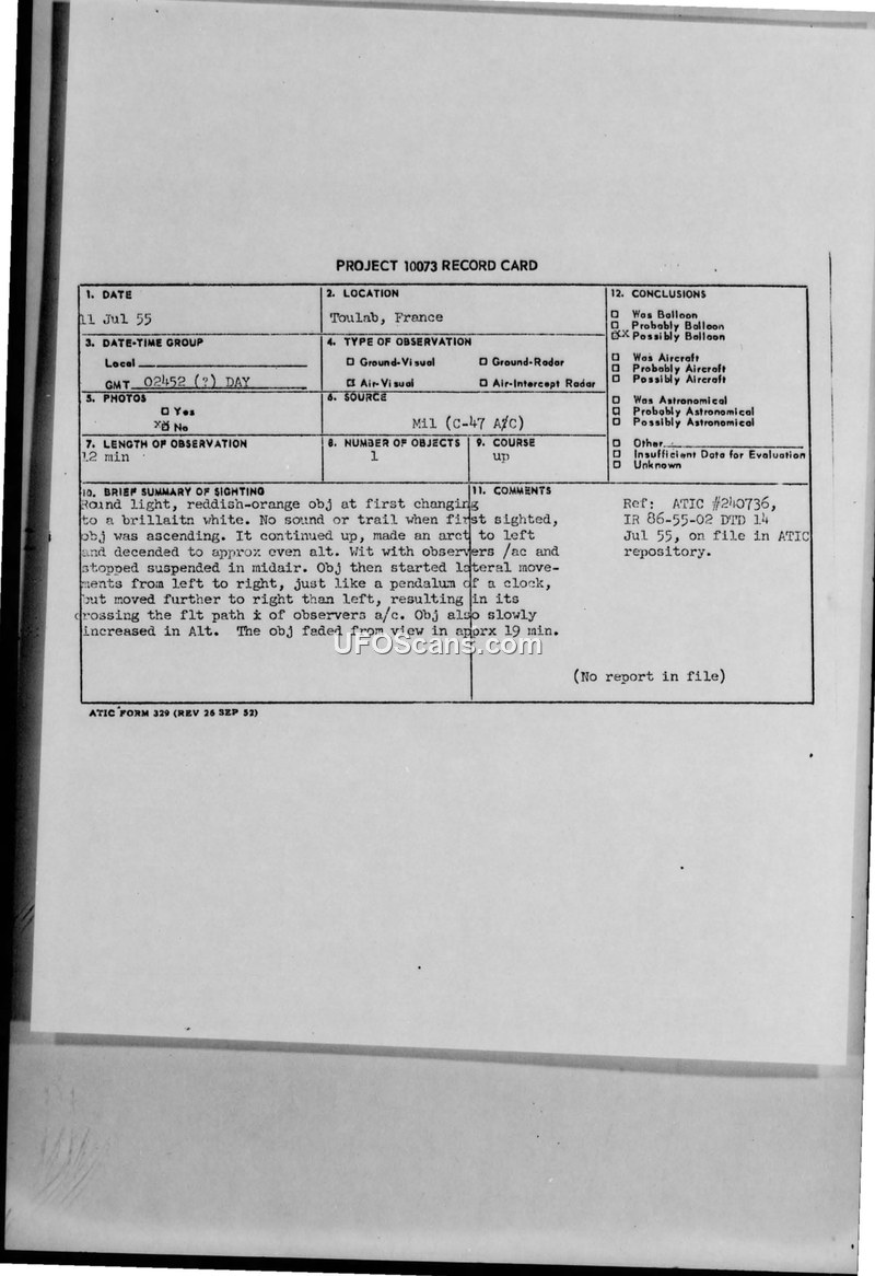 This document is a Project 10073 record card detailing an unidentified aerial phenomenon sighting that occurred on July 11, 1955, near Toulab, France. The observation was made by personnel aboard a C-47 aircraft. The object was described as a round, reddish-orange light that transitioned to a brilliant white color. Upon initial sighting, the object was ascending and produced no sound or trail. It performed a series of complex maneuvers, including an arc to the left, a descent to an approximate even altitude, and a period of suspension in midair. Subsequently, the object engaged in lateral movements from left to right, described as being similar to the motion of a pendulum, which resulted in the object crossing the flight path of the observers' aircraft. Throughout the encounter, the object slowly increased in altitude before fading from view after approximately 19 minutes. The total duration of the observation was recorded as 12 minutes. The record card notes that there were no photographs taken and no radar contact established. The official conclusion reached by ATIC was that the object was 'Possibly Balloon.' The document references ATIC #240736 and IR 86-55-02, dated July 14, 1955, and notes that no formal report was available in the file.